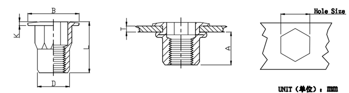 Thread P/N T(GRIP RANGE) A Hole Size D B K L Min Max Ref +0.1 ±0.05(*±0.08) ±0.25(*±0.3) ±0.1(*±0.15) ±0.25(*±0.3) 0 M4*0.7 FH-IHB-UK-0420