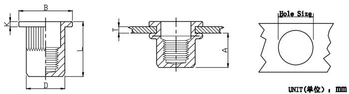 Thread P/N T(GRIP RANGE) A Hole Size D B K L Min Max Ref +0.1 +0.07 0 -0.1 M4*0.7 FH-KBC-0420 0.5-2.0 11.3 6.0 5.9 9.0±0.3 0.8±0.1 16.0±0.3 M4*0.7 FH-KBC-0440 2.0-4.0 11.3 6.0 5.9 9.0±0.3 0.8±0.1 18.0±0.3 M5*0.8 FH-KBC-0530 0.5-2.5 11.5 7.0 6.9 10.0±0.3 1.0±0.1 17.0±0.3 M5*0.8 FH-KBC-0550 2.5-5.0 11.5 7.0 6.9 10.0±0.3 1.0±0.1 19.0±0.3 M6*1.0 FH-KBC-0630 0.5-3.0 12.7 9.0 8.9 12.3±0.3 1.3 +0.2 19.2±0.3 -0.05 M6*1.0 FH-KBC-0650 3.0-5.0 12.7 9.0 8.9 12.3±0.3 1.3 +0.2 21.0±0.3 -0.05 M8*1.25 FH-KBC-0630 0.5-3.0 14.8 11.0 10.9 15.0±0.3 1.5±0.15 21.5±0.3 M8*1.25 FH-KBC-0855 3.0-5.5 14.8 11.0 10.9 15.0±0.3 1.5±0.15 24.0±0.3 M10*1.5 FH-KBC-1040 1.0-4.0 19.2 13.0 12.9 17.0±0.3 1.6±0.15 27.0±0.3