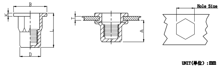 Thread P/N T(GRIP RANGE) A Hole Size D B K L Min Max Ref +0.1 +0.07 0 -0.1 M4*0.7 FH-SHBC-0420 0.5-2.0 11.0 6.0 5.9 9.0±0.3 0.8±0.1 15.0±0.25 M5*0.8 FH-SHBC-0525 0.5-2.5 13.5 7.0 6.9 10.0±0.3 1.0±0.15 18.0±0.3 M6*1.0 FH-SHBC-0630 0.5-3.0 17.0 9.0 8.9 12.7±0.3 1.3 +0.15 23.0±0.3 -0.1 M8*1.25 FH-SHBC-0835 1.0-3.5 19.0 11.0 10.9 16.0±0.3 1.5±0.15 26.0±0.3 M10*1.5 FH-SHBC-1035 1.0-4.0 25.0 13.0 12.9 19.0±0.3 1.7±0.15 33.0±0.3