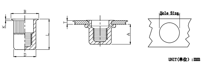 Thread P/N T(GRIP RANGE) A Hole Size D B K L Min Max Ref +0.1 +0.07 0 -0.1 M4*0.7 RH-KBC-0420 0.5-2.0 11.0 6.0 5.9 7.0 +0.2 0.5±0.1 15.0±0.25 -0.1 M4*0.7 RH-KBC-0435 2.0-3.5 11.0 6.0 5.9 7.0 +0.2 0.5±0.1 16.5±0.3 -0.1 M5*0.8 RH-KBC-0520 0.5-2.0 12.5 7.0 6.9 8.0 +0.25 0.5±0.1 16.5±0.3 -0.1 M5*0.8 RH-KBC-0535 2.0-3.5 12.5 7.0 6.9 8.0 +0.25 0.5±0.1 18.0±0.3 -0.1 M6*1.0 RH-KBC-0630 0.5-3.0 15.5 9.0 8.9 10.0 +0.25 0.6±0.15 20.5±0.3 -0.1 M6*1.0 RH-KBC-0645 3.0-4.5 15.5 9.0 8.9 10.0 +0.25 0.6±0.15 22.0±0.3 -0.1 M8*1.25 RH-KBC-0830 0.5-3.0 17.0 11.0 10.9 12.0 +0.25 0.65±0.15 23.0±0.3 -0.1 M8*1.25 RH-KBC-0845 3.0-4.5 17.0 11.0 10.9 12.0 +0.25 0.65±0.15 24.5±0.3 -0.1 M10*1.5 RH-KBC-1030 1.0-3.0 18.2 13.0 12.9 14.0 +0.35 0.7±0.15 24.5±0.35 -0.1 M10*1.5 RH-KBC-1050 3.5-5.0 18.2 13.0 12.9 14.0 +0.35 0.7±0.15 26.0±0.35 -0.1