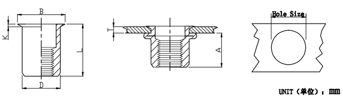 Thread P/N T(GRIP RANGE) A Hole Size D B K L Min Max Ref +0.1 +0.07 0 -0.1 M3*0.5 RH-RB-0315 0.5-2.0 6.2 5.0 4.9 6.0 +0.2 0.5±0.1 9.0±0.2 -0.1 M4*0.7 RH-RB-0420 0.5-2.0 6.5 6.0 5.9 7.0 +0.2 0.5±0.1 10.5±0.25 -0.1 M4*0.7 RH-RB-0440 2.0-4.0 6.5 6.0 5.9 7.0 +0.2 0.5±0.1 13.0±0.25 -0.1 M5*0.8 RH-RB-0520 0.5-2.0 7.0 7.0 6.9 8.0 +0.25 0.5±0.1 11.5±0.25 -0.1 M5*0.8 RH-RB-0540 2.0-4.0 7.0 7.0 6.9 8.0 +0.25 0.5±0.1 13.0±0.25 -0.1 M6*1.0 RH-RB-0625 0.5-2.5 8.5 9.0 8.9 10.5 ±0.2 0.6±0.15 14.0±0.3 M6*1.0 RH-RB-0650 2.5-5.0 8.5 9.0 8.9 10.0 +0.25 0.6±0.15 17.0±0.3 -0.1 M8*1.25 RH-RB-0830 0.5-3.0 10.0 11.0 10.9 12.0 +0.25 0.65±0.15 16.5±0.3 -0.1 M8*1.25 RH-RB-0850 3.0-5.0 10.0 11.0 10.9 12.0 +0.25 0.65±0.15 18.5±0.3 -0.1 M10*1.5 RH-RB-1030 0.5-3.0 12.0 13.0 12.9 14.1 +0.3 0.7±0.15 17.7±0.3 -0.1 M10*1.5 RH-RB-1055 3.0-5.5 13.0 13.0 12.9 14.1 +0.3 0.7±0.15 21.0±0.3 -0.1 M10*1.5 RH-RB-103012H 0.5-3.0 12.5 12.0 11.9 13.0 +0.25 0.7±0.15 18.0±0.3 -0.1