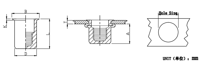 Thread P/N T(GRIP RANGE) A Hole Size D B K L Min Max Ref +0.1 +0.07 0 -0.1 M4*0.7 RH-RBC-0420 0.5-2.0 11.0 6.0 5.9 7.0 +0.2 0.5±0.1 15.0±0.3 -0.1 M4*0.7 RH-RBC-0435 2.0-3.5 11.0 6.0 5.9 7.0 +0.2 0.5±0.1 16.0±0.3 -0.1 M5*0.8 RH-RBC-0520 0.5-2.0 12.5 7.0 6.9 8.0 +0.25 0.5±0.1 16.5±0.3 -0.1 M5*0.8 RH-RBC-0535 2.0-3.5 12.5 7.0 6.9 8.0 +0.25 0.5±0.1 17.5±0.3 -0.1 M6*1.0 RH-RBC-0625 0.5-2.5 15.5 9.0 8.9 10.0 +0.25 0.6±0.15 20.5±0.3 -0.1 M6*1.0 RH-RBC-0640 2.5-4.0 15.5 9.0 8.9 10.0 +0.25 0.6±0.15 22.0±0.3 -0.1 M8*1.25 RH-RBC-0830 0.5-3.0 17.0 11.0 10.9 12.0 +0.25 0.65±0.15 23.0±0.3 -0.1 M8*1.25 RH-RBC-0845 2.5-4.5 17.0 11.0 10.9 12.0 +0.25 0.65±0.15 24.5±0.3 -0.1 M10*1.5 RH-RBC-1030 1.0-3.0 18.2 13.0 12.9 14.1 +0.3 0.7±0.15 24.5±0.35 -0.1 M10*1.5 RH-RBC-1050 3.0-5.0 18.2 13.0 12.9 14.1 +0.3 0.7±0.15 26.0±0.35 -0.1