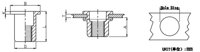 Thread P/N T(GRIP RANGE) A Hole Size D B K L Min Max Ref +0.1 +0.07 ±0.3(*±0.25) ±0.15(*±0.1) ±0.3(*±0.25) 0 -0.1 M4*0.7 FH-RB/AL-0420 0.5-2.0 6.0 6.0 5.9 8.8* 0.8* 10.5* M5*0.8 FH-RB/AL-0525 0.5-2.5 7.5 7.0 6.9 10.0 1.0 13.0 M6*1.0 FH-RB/AL-0625 0.5-3.0 9.2 9.0 8.9 12.3 1.5 15.0 M8*1.25 FH-RB/AL-0830 1.0-3.5 10.2 11.0 10.9 14.3 1.5 16.5 M10*1.5 FH-RB/AL-1040 1.0-4.0 11.5 13.0 12.9 16.3 1.6 19.0
