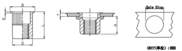 Thread P/N T(GRIP RANGE) A Hole Size D B K L Min Max Ref +0.1 +0.07 ±0.1(*±0.15) ±0.25(*±0.3) 0 -0.1 M4*0.7 RH-KB/AL-0420 0.5-2.0 6.0 6.0 5.9 7.0 +0.2 0.5 10.5 -0.1 M5*0.8 RH-KB/AL-0520 0.5-2.0 7.5 7.0 6.9 8.0 +0.25 0.5 11.5 -0.1 M6*1.0 RH-KB/AL-0625 0.5-2.5 9.2 9.0 8.9 10.0 +0.25 0.6* 14.0* -0.1 M8*1.25 RH-KB/AL-0825 0.5-2.5 10.2 11.0 10.9 12.0 +0.25 0.65* 15.5* -0.1 M10*1.5 RH-KB/AL-1030 1.0-3.0 11.5 13.0 12.9 14.1 +0.3 0.7* 17.7* -0.1