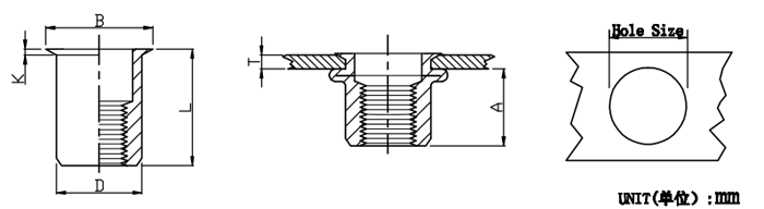 Thread P/N T(GRIP RANGE) A Hole Size D B K L Min Max Ref +0.1 +0.07 ±0.1(*±0.15) ±0.25(*±0.3) 0 -0.1 M4*0.7 RH-RB/AL-0420 0.5-2.0 6.0 6.0 5.9 7.0 +0.2 0.5 10.5 -0.1 M5*0.8 RH-RB/AL-0520 0.5-2.0 7.5 7.0 6.9 8.0 +0.25 0.5 11.5 -0.1 M6*1.0 RH-RB/AL-0625 0.5-2.5 9.2 9.0 8.9 10.0 +0.25 0.6* 14.0* -0.1 M8*1.25 RH-RB/AL-0825 0.5-2.5 10.2 11.0 10.9 12.0 +0.25 0.65* 15.5* -0.1 M10*1.5 RH-RB/AL-1030 1.0-3.0 11.5 13.0 12.9 14.1 +0.3 0.7* 17.7* -0.1