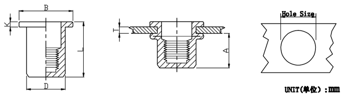 Thread P/N T(GRIP RANGE) A Hole Size D B K L Min Max Ref +0.1 +0.07 0 -0.1 M4*0.7 FH-RBC/SS-0420 0.5-2.0 11.3 6.0 5.9 9.0±0.25 0.8±0.1 16.0±0.25 M5*0.8 FH-RBC/SS-0525 0.5-2.5 13.8 7.0 6.9 10.0±0.3 1.0±0.15 19.0±0.3 M6*1.0 FH-RBC/SS-0630 0.5-3.0 15.0 9.0 8.9 12.3±0.3 1.3 +0.2 21.0±0.3 -0.05 M8*1.25 FH-RBC/SS-0835 1.0-3.5 18.2 11.0 10.9 15.0±0.3 1.5±0.15 25.0±0.3 M10*1.5 FH-RBC/SS-1040 1.0-4.0 19.4 13.0 12.9 17.0±0.3 1.6±0.15 27.0±0.3