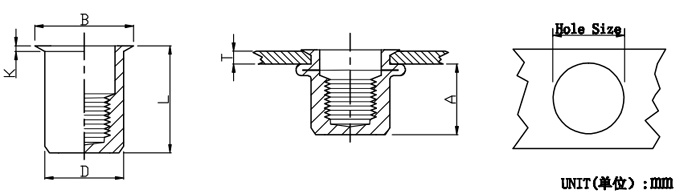 Thread P/N T(GRIP RANGE) A Hole Size D B K L Min Max Ref +0.1 +0.07 0 -0.1 M4*0.7 RH-RBC/SS-0420 0.5-2.0 11.0 6.0 5.9 7.0 +0.2 0.5±0.1 15.0±0.25 -0.1 M5*0.8 RH-RBC/SS-0520 0.5-2.0 12.5 7.0 6.9 8.0 +0.25 0.5±0.1 16.5±0.25 -0.1 M6*1.0 RH-RBC/SS-0625 0.5-2.5 15.5 9.0 8.9 10.0 +0.25 0.6±0.15 20.5±0.3 -0.1 M8*1.25 RH-RBC/SS-0830 0.5-3.0 17.6 11.0 10.9 12.0 +0.25 0.65±0.15 23.0±0.3 -0.1 M10*1.5 RH-RBC/SS-1035 1.0-3.5 18.3 13.0 12.9 14.0 +0.35 0.7±0.15 24.5±0.3 -0.1