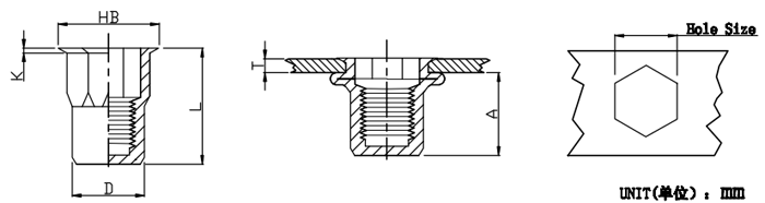 Thread P/N T(GRIP RANGE) A Hole Size D HB K L Min Max Ref +0.1 +0.07 +0.25 (* +0.3 ) 0 -0.1 -0.1 -0.1 M4*0.7 RHH-IHBC/SS-0420 0.5-2.0 11.5 6.0 5.9 7.0 0.5±0.1 15.5±0.25 M5*0.8 RHH-IHBC/SS-0525 0.5-2.5 13.5 7.0 6.9 8.0 0.5±0.1 18.0±0.25 M6*1.0 RHH-IHBC/SS-0630 0.5-3.0 15.8 9.0 8.9 10.0 0.6±0.15 21.5±0.3 M8*1.25 RHH-IHBC/SS-0835 1.0-3.5 18.2 11.0 10.9 12.0 0.65±0.15 24.0±0.3 M10*1.5 RHH-IHBC/SS-1040 1.0-4.0 23.2 13.0 12.9 14.5 0.75±0.15 30.5±0.35